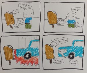 In this workshop, I learned that comics can be used like a journal, a non-linear form of story-telling to record your deepest, darkest, and most intimate thoughts. Or, in my case, it can be used as a silly way to teach a lesson. Here’s the comic that I created last night: